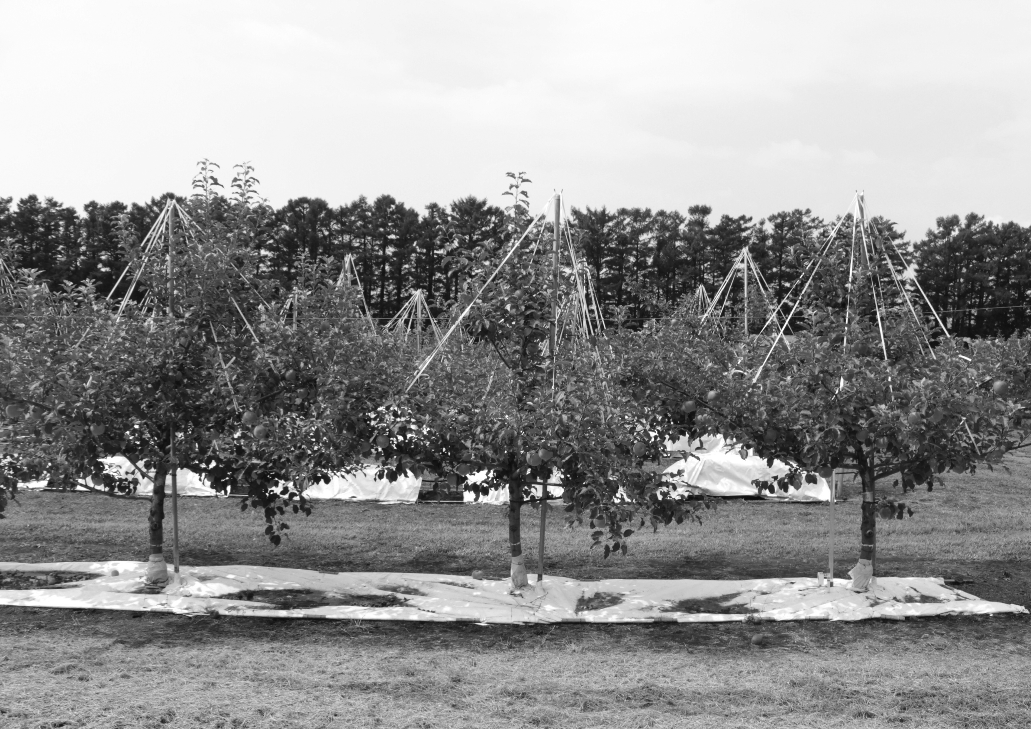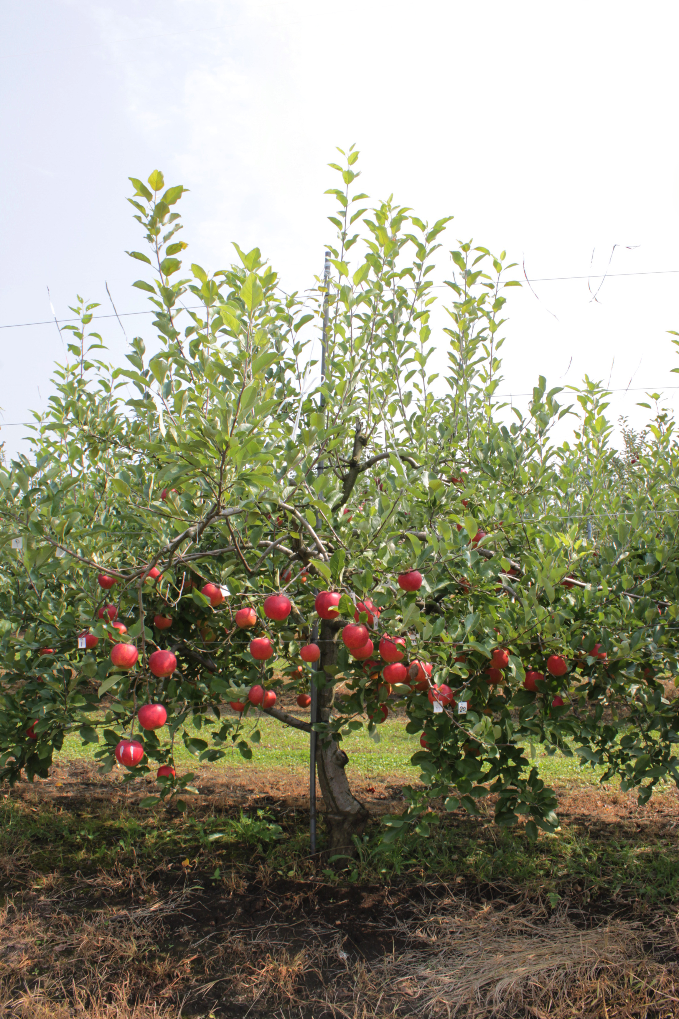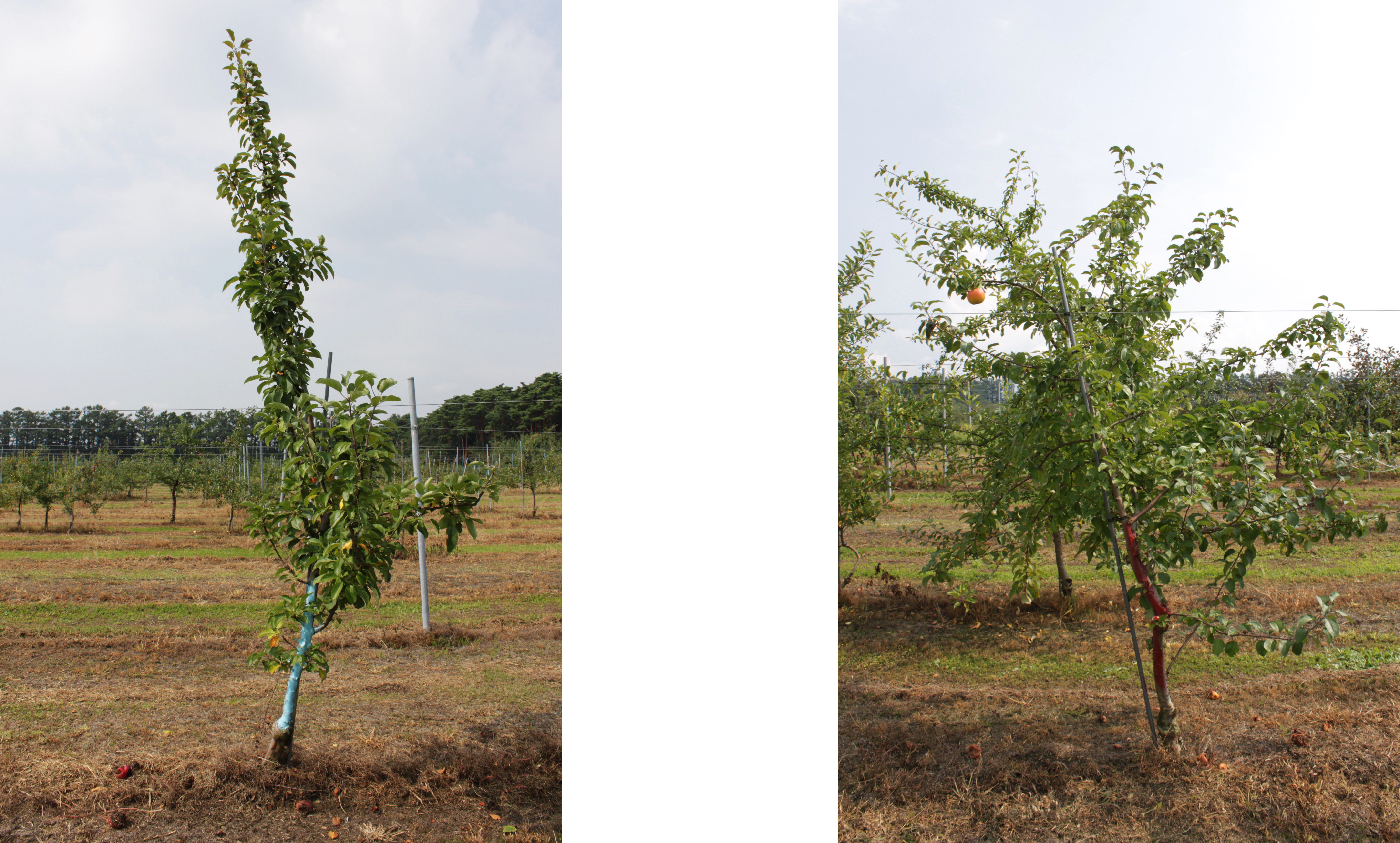Apple trees grafted on dwarfing rootstocks (6-year-old) in the Apple Research Station in NARO institute of Fruit Tree Science, Morioka, Iwate, Japan